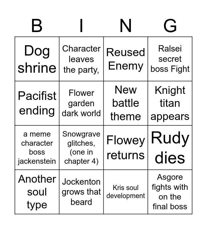 This bingo card has 16 words: Jockenton grows that beard, Rudy dies, Reused Enemy, Dog shrine, a meme character boss jackenstein, Character leaves the party,, Flowey returns, Kris soul development, Pacifist ending, Flower garden dark world, Another soul type, Ralsei secret boss Fight, Snowgrave glitches, (one in chapter 4), Knight titan appears, New battle theme and Asgore fights with on the final boss.