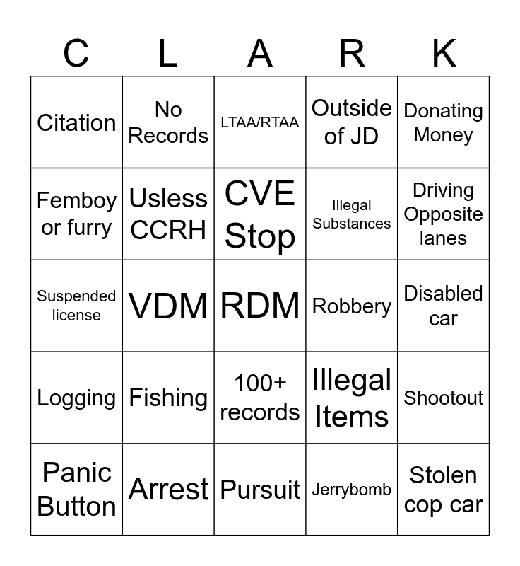 This bingo card has a free space and 24 words: Fishing, Arrest, CVE Stop, Panic Button, Donating Money, Citation, Femboy or furry, No Records, Robbery, 100+ records, Illegal Substances, Suspended license, Illegal Items, Shootout, Usless CCRH, Jerrybomb, Disabled car, LTAA/RTAA, Driving Opposite lanes, VDM, Stolen cop car, Logging, Outside of JD and Pursuit.