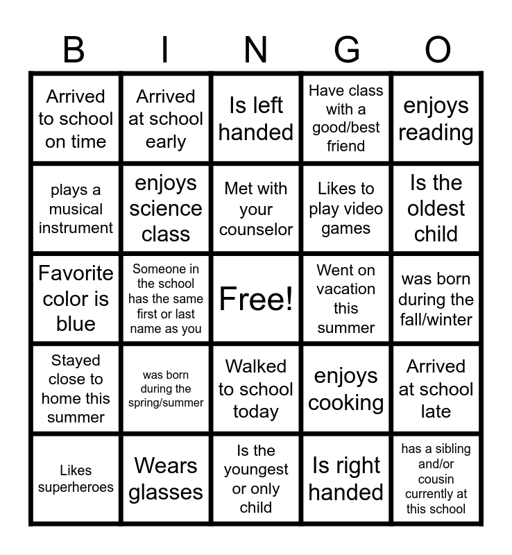 This bingo card has a free space and 29 words: Likes superheroes, Plays a sport, Someone in the school has the same first or last name as you, Wears earrings, Arrived to school on time, Is left handed, enjoys science class, was born during the spring/summer, Went on vacation this summer, Wears glasses, was born during the fall/winter, has a sibling and/or cousin currently at this school, Is the youngest or only child, Is right handed, Is the oldest child, has a pet, Walked to school today, Stayed close to home this summer, enjoys reading, Favorite color is blue, enjoys cooking, prefers tik tok over snap or insta, Likes to play video games, plays a musical instrument, Have class with a good/best friend, Arrived at school early, Arrived at school late, Met with your counselor and Played Kahoot!.