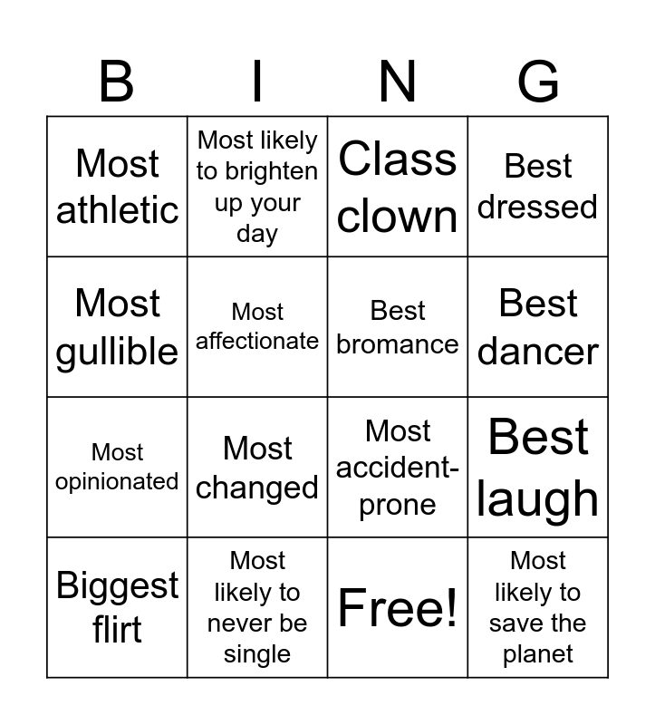 This bingo card has 17 words: Free!, Biggest flirt, Class clown, Most athletic, Most changed, Best dressed, Best laugh, Best bromance, Best dancer, Most affectionate, Most likely to never be single, Most accident-prone, Most gullible, Most likely to brighten up your day, Most opinionated, Most likely to get married first and Most likely to save the planet.