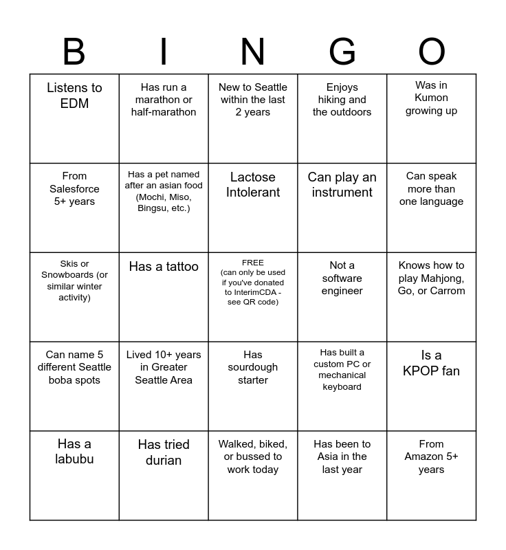 This bingo card has a free space and 24 words: Lived 10+ years in Greater Seattle Area, Has tried durian, Lactose Intolerant, Has a labubu, Was in Kumon growing up, Listens to EDM, From Salesforce 5+ years, Has run a marathon or half-marathon, Not a software engineer, Has sourdough starter, Can play an instrument, Skis or Snowboards (or similar winter activity), Has built a custom PC or mechanical keyboard, Is a KPOP fan, Has a pet named after an asian food (Mochi, Miso, Bingsu, etc.), Has been to Asia in the last year, Knows how to play Mahjong, Go, or Carrom, New to Seattle within the last 2 years, Can speak more than one language, Has a tattoo, From Amazon 5+ years, Can name 5 different Seattle boba spots, Enjoys hiking and the outdoors and Walked, biked, or bussed to work today.