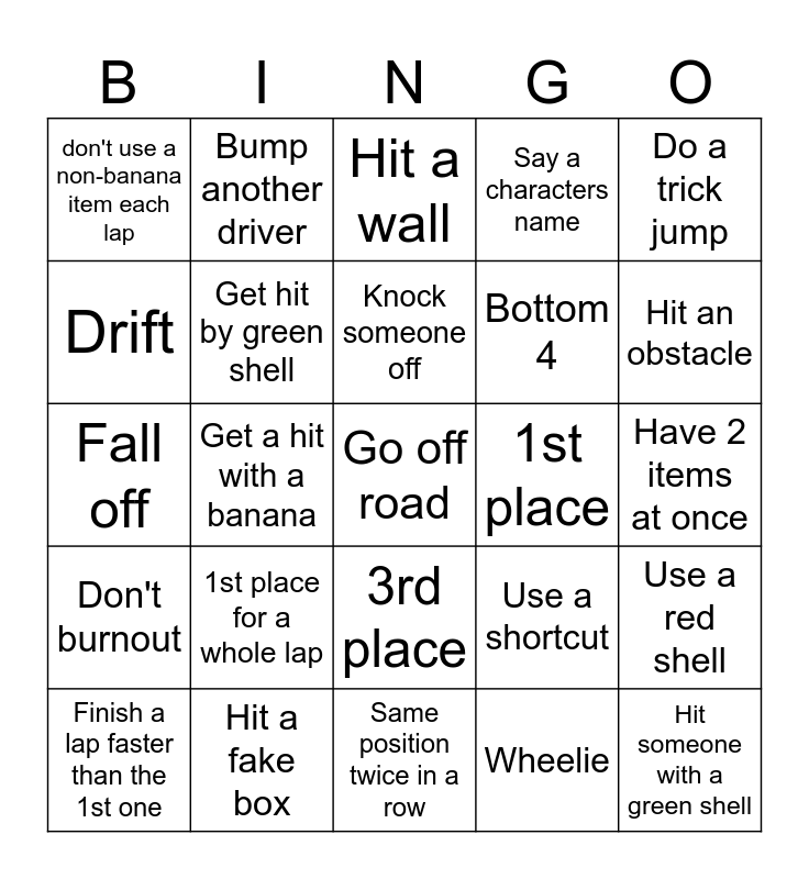 This bingo card has a free space and 25 words: 1st place for a whole lap, Same position twice in a row, Knock someone off, Finish a lap faster than the 1st one, Do a trick jump, don't use a non-banana item each lap, Drift, Bump another driver, 1st place, 3rd place, Bottom 4, Fall off, Use a shortcut, Use a red shell, Get hit by green shell, Hit 2 item boxes simultaneously, Have 2 items at once, Hit a wall, Hit an obstacle, Get a hit with a banana, Hit someone with a green shell, Hit a fake box, Don't burnout, Say a characters name and Wheelie.