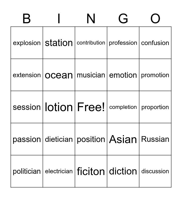 This bingo card has a free space and 24 words: dietician, electrician, musician, politician, confusion, explosion, extension, station, completion, position, emotion, session, Asian, Russian, ocean, diction, proportion, contribution, promotion, lotion, discussion, passion, profession and ficiton.