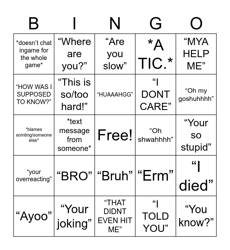 This bingo card has a free space and 24 words: “BRO”, “Your joking”, “HUAAAHGG”, “Ayoo”, “MYA HELP ME”, *doesn’t chat ingame for the whole game*, “HOW WAS I SUPPOSED TO KNOW?”, “Where are you?”, “Oh shwahhhh”, “Bruh”, “I DONT CARE”, *blames somting/someone else*, “Erm”, “I died”, “This is so/too hard!”, “I TOLD YOU”, “Your so stupid”, “Are you slow”, “Oh my goshuhhhh”, *text message from someone*, “You know?”, “your overreacting”, *A TIC.* and “THAT DIDNT EVEN HIT ME”.