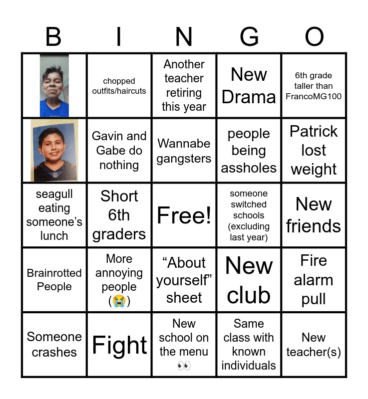 This bingo card has 2 images, a free space and 22 words: More annoying people (😭), Fight, Wannabe gangsters, Someone crashes, 6th grade taller than FrancoMG100, chopped outfits/haircuts, someone switched schools (excluding last year), “About yourself” sheet, people being assholes, seagull eating someone’s lunch, New club, Fire alarm pull, Gavin and Gabe do nothing, Same class with known individuals, New friends, Another teacher retiring this year, Patrick lost weight, Short 6th graders, New teacher(s), Brainrotted People, New Drama and New school on the menu 👀.