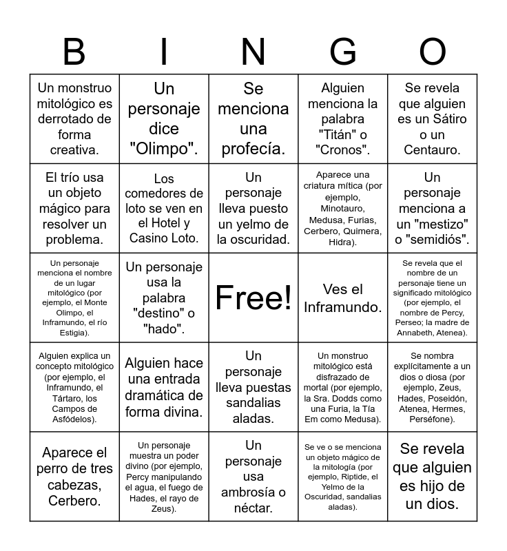 This bingo card has a free space and 28 words: Se nombra explícitamente a un dios o diosa (por ejemplo, Zeus, Hades, Poseidón, Atenea, Hermes, Perséfone)., Se menciona a un héroe de la mitología griega (por ejemplo, Hércules, Aquiles, Perseo, Teseo)., Aparece una criatura mítica (por ejemplo, Minotauro, Medusa, Furias, Cerbero, Quimera, Hidra)., Se ve o se menciona un objeto mágico de la mitología (por ejemplo, Riptide, el Yelmo de la Oscuridad, sandalias aladas)., El trío usa un objeto mágico para resolver un problema., Se menciona una profecía., Un personaje dice "Olimpo"., Alguien explica un concepto mitológico (por ejemplo, el Inframundo, el Tártaro, los Campos de Asfódelos)., Ves el Inframundo., Aparece el perro de tres cabezas, Cerbero., Un personaje menciona el nombre de un lugar mitológico (por ejemplo, el Monte Olimpo, el Inframundo, el río Estigia)., Alguien menciona la palabra "Titán" o "Cronos"., Un personaje muestra un poder divino (por ejemplo, Percy manipulando el agua, el fuego de Hades, el rayo de Zeus)., Un personaje usa ambrosía o néctar., Un personaje menciona a un "mestizo" o "semidiós"., Un dios o diosa se muestra en forma humana., Alguien hace una entrada dramática de forma divina., Los comedores de loto se ven en el Hotel y Casino Loto., Un personaje lleva puesto un yelmo de la oscuridad., Un personaje lleva puestas sandalias aladas., Un monstruo mitológico es derrotado de forma creativa., Un personaje hace una referencia directa a una historia mitológica (por ejemplo, el mito de Perseo y Medusa, Teseo y el Minotauro)., Se revela que alguien es hijo de un dios., Un personaje usa la palabra "destino" o "hado"., Se revela que el nombre de un personaje tiene un significado mitológico (por ejemplo, el nombre de Percy, Perseo; la madre de Annabeth, Atenea)., Un monstruo mitológico está disfrazado de mortal (por ejemplo, la Sra. Dodds como una Furia, la Tía Em como Medusa)., Se revela que alguien es un Sátiro o un Centauro. and Ves una Nereida (ninfa del agua) u otro tipo de ninfa..