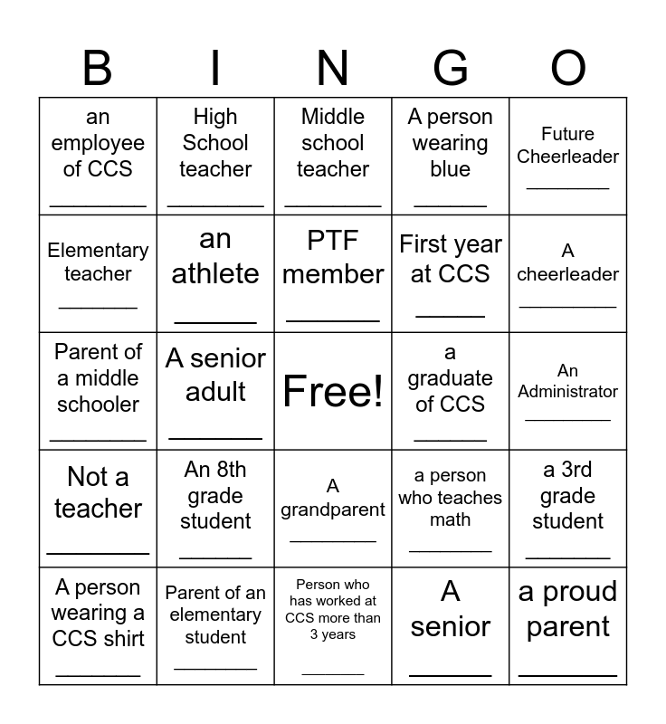 This bingo card has a free space and 27 words: a person who teaches math ________, A Coach ______, First year at CCS _____, Person who has worked at CCS more than 3 years ________, Elementary teacher _______, Middle school teacher ________, High School teacher ________, Not a teacher _______, a graduate of CCS ______, a 3rd grade student _______, Parent of a middle schooler ________, A person wearing blue ______, A person wearing a CCS shirt _______, Parent of an elementary student ________, A cheerleader _________, a 5th grade student _______, an athlete _____, PTF member ______, An 8th grade student ______, an employee of CCS ________, An Administrator _________, A senior _____, A senior adult ______, a proud parent ______, A grandparent ________, Future Cheerleader ________ and A student who loves recess ________.
