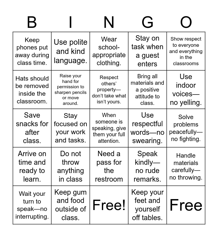 This bingo card has 25 words: Arrive on time and ready to learn., Keep gum and food outside of class., When someone is speaking, give them your full attention., Keep your feet and yourself off tables., Show respect to everyone and everything in the classrooms, Keep phones put away during class time., Use polite and kind language., Wear school-appropriate clothing., Use respectful words—no swearing., Handle materials carefully—no throwing., Hats should be removed inside the classroom., Raise your hand for permission to sharpen pencils or move around., Free!, Speak kindly—no rude remarks., Use indoor voices—no yelling., Wait your turn to speak—no interrupting., Stay focused on your work and tasks., Respect others’ property—don’t take what isn’t yours., Bring all materials and a positive attitude to class., Solve problems peacefully—no fighting., Save snacks for after class., Do not throw anything in class, Need a pass for the restroom, Stay on task when a guest enters and Free.