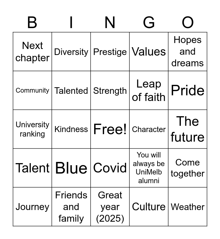 This bingo card has a free space and 24 words: Blue, Friends and family, Strength, Journey, Hopes and dreams, Next chapter, Community, Diversity, Character, Covid, Leap of faith, University ranking, You will always be UniMelb alumni, Come together, Talented, Culture, The future, Prestige, Pride, Kindness, Weather, Talent, Values and Great year (2025).