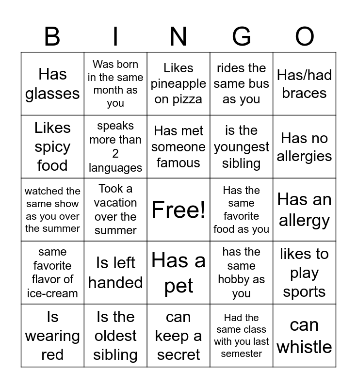 This bingo card has a free space and 24 words: Is left handed, Is the oldest sibling, Has met someone famous, Is wearing red, Has/had braces, Has glasses, Likes spicy food, Was born in the same month as you, Has the same favorite food as you, Has a pet, is the youngest sibling, watched the same show as you over the summer, has the same hobby as you, likes to play sports, speaks more than 2 languages, Had the same class with you last semester, Has an allergy, Likes pineapple on pizza, Has no allergies, Took a vacation over the summer, can whistle, same favorite flavor of ice-cream, rides the same bus as you and can keep a secret.
