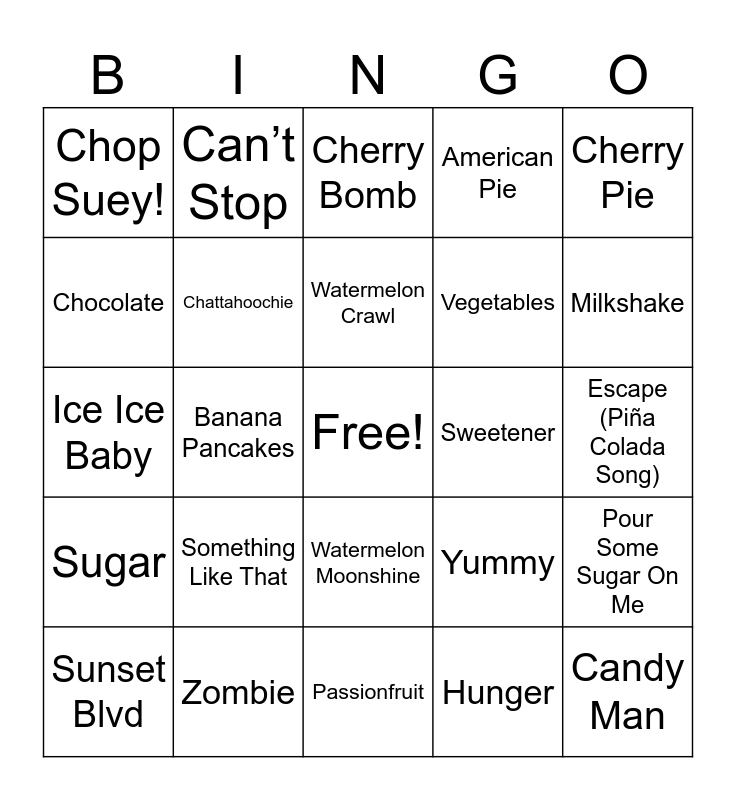 This bingo card has a free space and 37 words: Chicken Fried, Watermelon Sugar, Banana Boat Song, Chattahoochie, Pour Some Sugar On Me, Something Like That, Watermelon Crawl, Me on You, Cherry Pie, That’s Amore, Banana Pancakes, American Pie, Candy Man, Escape (Piña Colada Song), Chocolate, Sugar, Peaches, Cherry Bomb, Watermelon Moonshine, Sweetener, Chop Suey!, Milkshake, Sunset Blvd, Passionfruit, Too Sweet, Hunger, Can’t Stop, Wannabe, Pump It, Linger, 1985, Zombie, Ice Ice Baby, Juice, Yummy, Vegetables and Cheeseburger in Paradise.