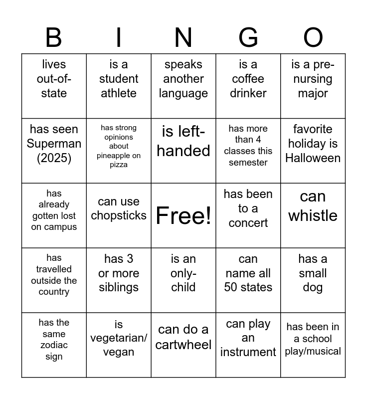This bingo card has a free space and 24 words: has 3 or more siblings, is vegetarian/ vegan, is left-handed, has the same zodiac sign, is a pre-nursing major, lives out-of-state, has seen Superman (2025), is a student athlete, has been to a concert, is an only-child, has more than 4 classes this semester, has already gotten lost on campus, can name all 50 states, has a small dog, has strong opinions about pineapple on pizza, can play an instrument, can whistle, speaks another language, favorite holiday is Halloween, can use chopsticks, has been in a school play/musical, has travelled outside the country, is a coffee drinker and can do a cartwheel.