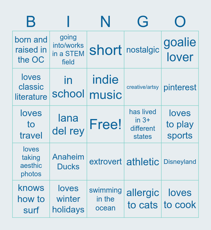 This bingo card has a free space and 24 words: Anaheim Ducks, loves winter holidays, indie music, knows how to surf, goalie lover, born and raised in the OC, loves classic literature, going into/works in a STEM field, has lived in 3+ different states, extrovert, creative/artsy, loves to travel, athletic, Disneyland, in school, allergic to cats, loves to play sports, short, pinterest, lana del rey, loves to cook, loves taking aesthic photos, nostalgic and swimming in the ocean.