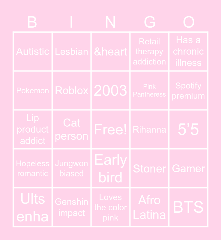 This bingo card has a free space and 24 words: Ults enha, Jungwon biased, 2003, Afro Latina, Has a chronic illness, Autistic, Lesbian, &heart, Rihanna, 5’5, Lip product addict, Roblox, Stoner, Gamer, Pokemon, Genshin impact, Loves the color pink, Retail therapy addiction, Spotify premium, Hopeless romantic, Cat person, Early bird, Pink Pantheress and BTS.
