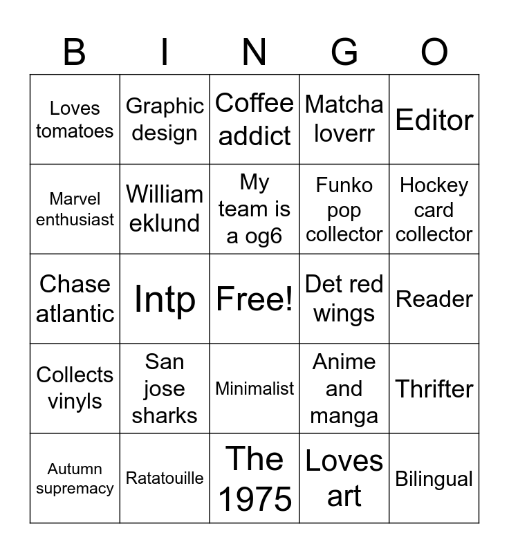 This bingo card has a free space and 24 words: San jose sharks, Ratatouille, My team is a og6, Autumn supremacy, Editor, Loves tomatoes, Marvel enthusiast, Graphic design, Det red wings, Minimalist, Funko pop collector, Chase atlantic, Anime and manga, Thrifter, William eklund, Loves art, Reader, Coffee addict, Hockey card collector, Intp, Bilingual, Collects vinyls, Matcha loverr and The 1975.