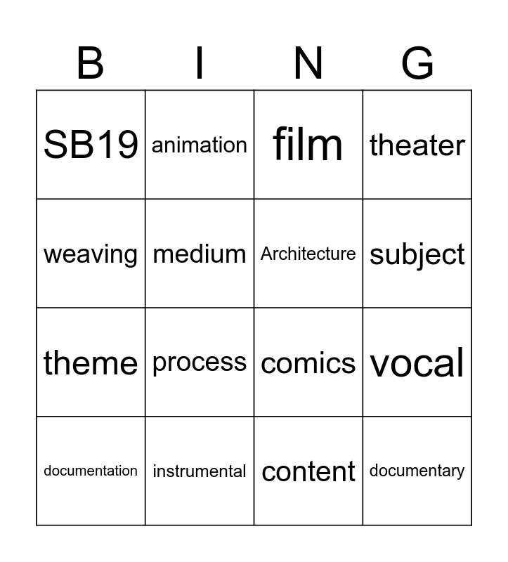 This bingo card has 16 words: documentation, instrumental, film, theater, weaving, animation, comics, vocal, SB19, medium, content, subject, theme, process, Architecture and documentary.