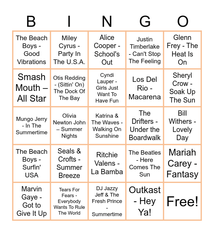 This bingo card has 31 words: DJ Jazzy Jeff & The Fresh Prince - Summertime, Martha & The Vandellas - Dancing in the Streets, Olivia Newton John – Summer Nights, The Black Eyed Peas - I Gotta Feeling, The Beach Boys - Good Vibrations, Alice Cooper - School's Out, Otis Redding - (Sittin' On) The Dock Of The Bay, The Beatles - Here Comes The Sun, The Drifters - Under the Boardwalk, Outkast - Hey Ya!, Bill Withers - Lovely Day, Katrina & The Waves - Walking On Sunshine, Free!, Katy Perry - California Gurls, Sheryl Crow - Soak Up The Sun, Maze featuring Frankie Beverly - Before I Let Go, Mariah Carey - Fantasy, Seals & Crofts - Summer Breeze, The Beach Boys - Surfin' USA, Ritchie Valens - La Bamba, Glenn Frey - The Heat Is On, Prince - When Doves Cry, Marvin Gaye - Got to Give It Up, Miley Cyrus - Party In The U.S.A., Los Del Rio - Macarena, Smash Mouth – All Star, Justin Timberlake - Can't Stop The Feeling, Mungo Jerry - In The Summertime, Tears For Fears - Everybody Wants To Rule The World, Cyndi Lauper - Girls Just Want To Have Fun and Taylor Swift - Shake It Off.