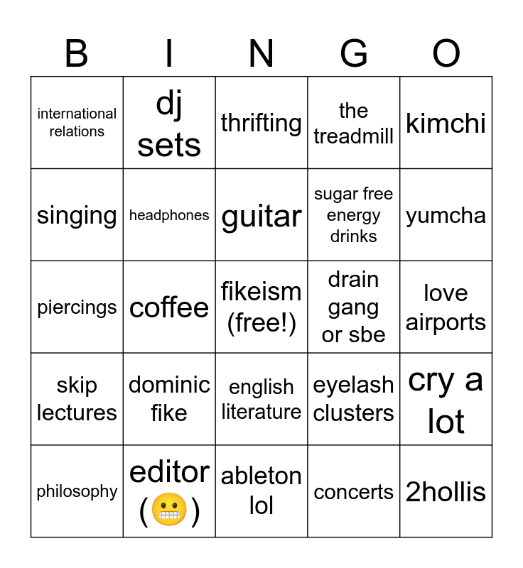 This bingo card has a free space and 24 words: dominic fike, editor (😬), guitar, philosophy, kimchi, international relations, singing, dj sets, drain gang or sbe, english literature, sugar free energy drinks, piercings, eyelash clusters, cry a lot, headphones, concerts, love airports, thrifting, yumcha, coffee, 2hollis, skip lectures, the treadmill and ableton lol.