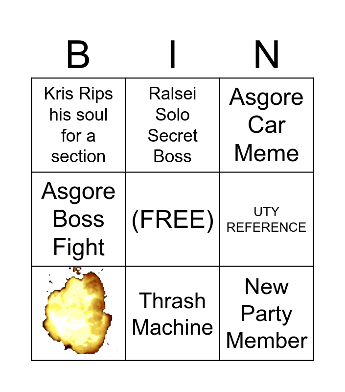 This bingo card has 1 images, a free space and 7 words: UTY REFERENCE, Asgore Car Meme, Ralsei Solo Secret Boss, Kris Rips his soul for a section, New Party Member, Asgore Boss Fight and Thrash Machine.