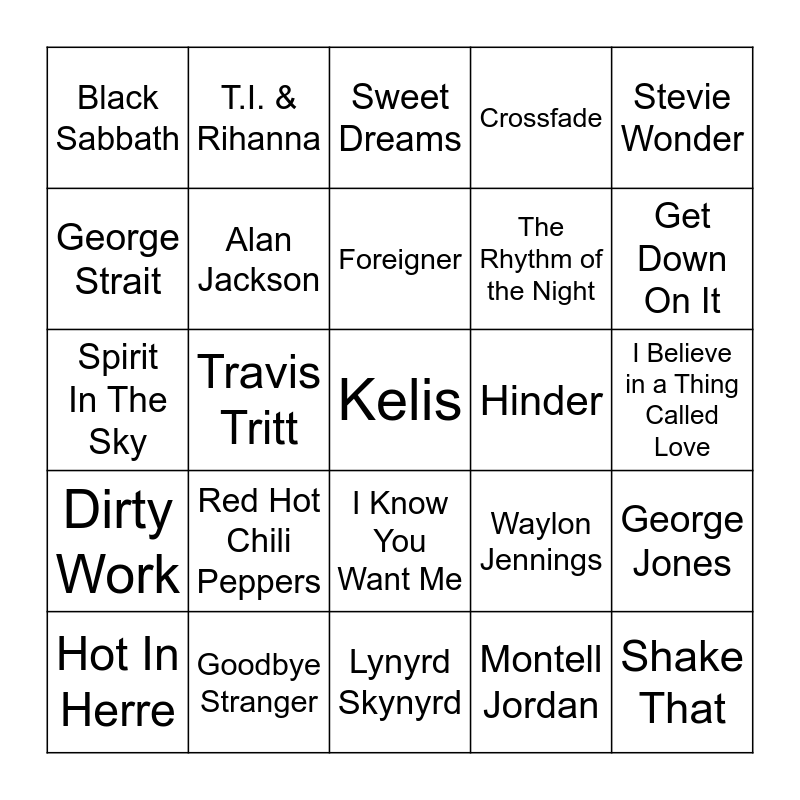 This bingo card has 49 words: Baby Bash, Kelis, Limp Bizkit, Lynyrd Skynyrd, Red Hot Chili Peppers, Soulja Boy, T.I. & Rihanna, Waka Flocka Flame, George Strait, Travis Porter, Alan Jackson, Crossfade, George Jones, Waylon Jennings, Outkast, Ludacris, Foreigner, Hinder, Alabama, Stevie Wonder, Travis Tritt, Montell Jordan, Black Sabbath, The Rhythm of the Night, Southern Nights, Get Down On It, Hot In Herre, Show Me The Way, I Know You Want Me, Dirty Work, Joker And The Thief, Brick House, Cherry Bomb, Fortunate Son, Goodbye Stranger, Goodies, How Low, Hypnotize, I Believe in a Thing Called Love, Jessica, Mr. Blue Sky, Push It To The Limit, Shake That, Shoot to Thrill, Spirit In The Sky, Sweet Dreams, Tambourine, Ventura Highway and Wham Bam Shang-A-Lang.