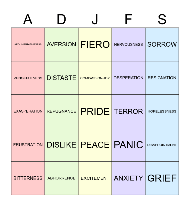This bingo card has 46 words: ANNOYANCE, DISLIKE, SCHADENFREUDE, TREPIDATION, DISAPPOINTMENT, BITTERNESS, AVERSION, RELIEF, NERVOUSNESS, DISCOURAGEMENT, ARGUMENTATIVENESS, DISTASTE, PEACE, ANXIETY, DISTRAUGHTNESS, FRUSTRATION, REPUGNANCE, PRIDE, DREAD, RESIGNATION, EXASPERATION, REVULSION, FIERO, DESPERATION, HELPLESSNESS, VENGEFULNESS, ABHORRENCE, NACHES, PANIC, HOPELESSNESS, FURY, LOATHING, WONDER, HORROR, MISERY, EXCITEMENT, TERROR, DESPAIR, ECSTASY, GRIEF, AMUSEMENT, SORROW, COMPASSION/JOY, ANGUISH, REJOICING and SENSORY PLEASURE.