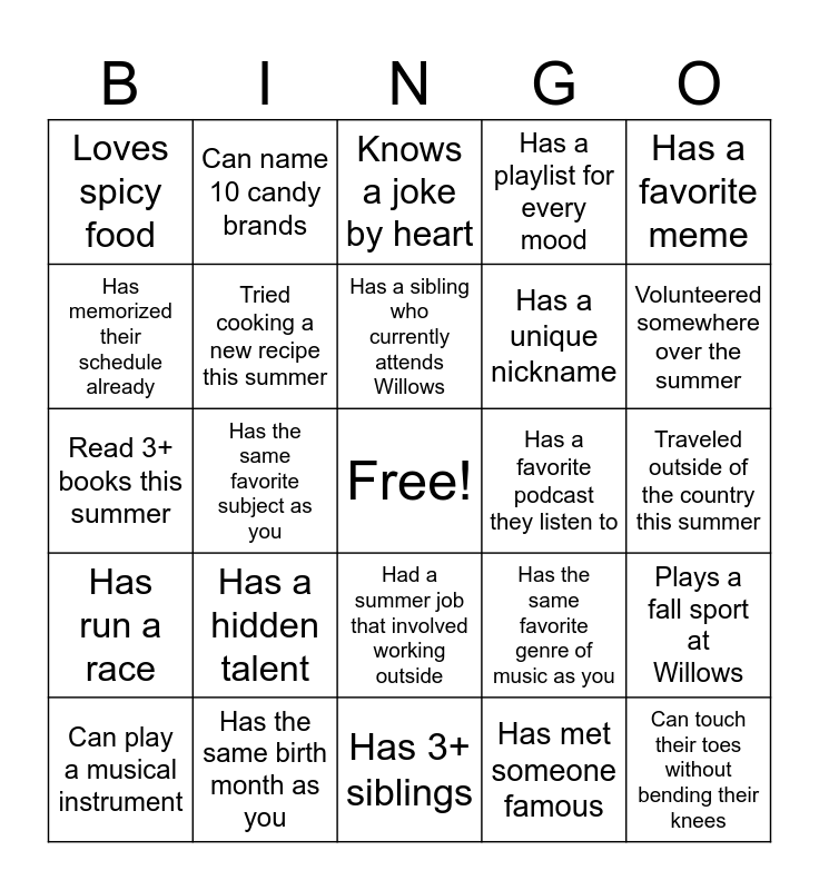 This bingo card has a free space and 24 words: Has a hidden talent, Has the same birth month as you, Has a sibling who currently attends Willows, Can play a musical instrument, Has a favorite meme, Loves spicy food, Has memorized their schedule already, Can name 10 candy brands, Has a favorite podcast they listen to, Had a summer job that involved working outside, Has a unique nickname, Read 3+ books this summer, Has the same favorite genre of music as you, Plays a fall sport at Willows, Tried cooking a new recipe this summer, Has met someone famous, Traveled outside of the country this summer, Knows a joke by heart, Volunteered somewhere over the summer, Has the same favorite subject as you, Can touch their toes without bending their knees, Has run a race, Has a playlist for every mood and Has 3+ siblings.