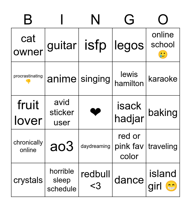 This bingo card has a free space and 24 words: crystals, ao3, singing, dance, online school 🥲, cat owner, guitar, isfp, isack hadjar, baking, fruit lover, anime, red or pink fav color, traveling, procrastinating 👎, horrible sleep schedule, redbull <3, legos, karaoke, chronically online, avid sticker user, daydreaming, lewis hamilton and island girl 😁.