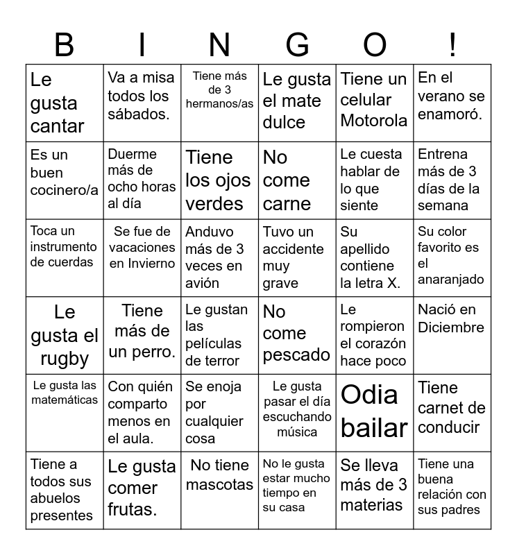 This bingo card has 36 words: Le gusta el rugby, Tiene más de un perro., No tiene mascotas, No come carne, Su apellido contiene la letra X., Su color favorito es el anaranjado, Le gusta cantar, Le gusta comer frutas., Tiene más de 3 hermanos/as, Le gusta pasar el día escuchando música, Le cuesta hablar de lo que siente, En el verano se enamoró., Le gusta las matemáticas, Se fue de vacaciones en Invierno, Tiene los ojos verdes, Le gusta el mate dulce, Odia bailar, Nació en Diciembre, Es un buen cocinero/a, Duerme más de ocho horas al día, Le gustan las películas de terror, No come pescado, Le rompieron el corazón hace poco, Tiene carnet de conducir, Toca un instrumento de cuerdas, Va a misa todos los sábados., Anduvo más de 3 veces en avión, No le gusta estar mucho tiempo en su casa, Tiene un celular Motorola, Entrena más de 3 días de la semana, Tiene a todos sus abuelos presentes, Con quién comparto menos en el aula., Se enoja por cualquier cosa, Tuvo un accidente muy grave, Se lleva más de 3 materias and Tiene una buena relación con sus padres.