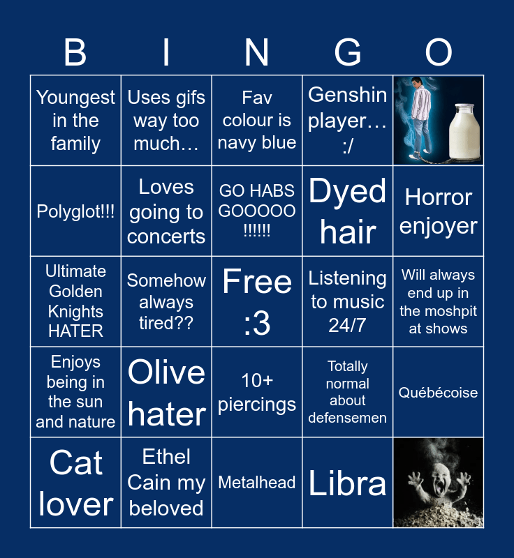 This bingo card has 2 images, a free space and 22 words: Olive hater, Ethel Cain my beloved, GO HABS GOOOOO !!!!!!, Cat lover, Youngest in the family, Polyglot!!!, Uses gifs way too much…, Listening to music 24/7, 10+ piercings, Dyed hair, Ultimate Golden Knights HATER, Totally normal about defensemen, Québécoise, Loves going to concerts, Libra, Will always end up in the moshpit at shows, Fav colour is navy blue, Horror enjoyer, Somehow always tired??, Enjoys being in the sun and nature, Genshin player… :/ and Metalhead.