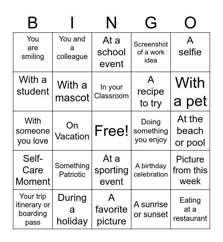 This bingo card has a free space and 24 words: Your trip itinerary or boarding pass, Something Patriotic, In your Classroom, A sunrise or sunset, A selfie, You are smiling, You and a colleague, At a school event, Doing something you enjoy, At the beach or pool, With someone you love, With a mascot, A birthday celebration, Picture from this week, With a student, During a holiday, A favorite picture, Screenshot of a work idea, With a pet, Self-Care Moment, On Vacation, At a sporting event, A recipe to try and Eating at a restaurant.