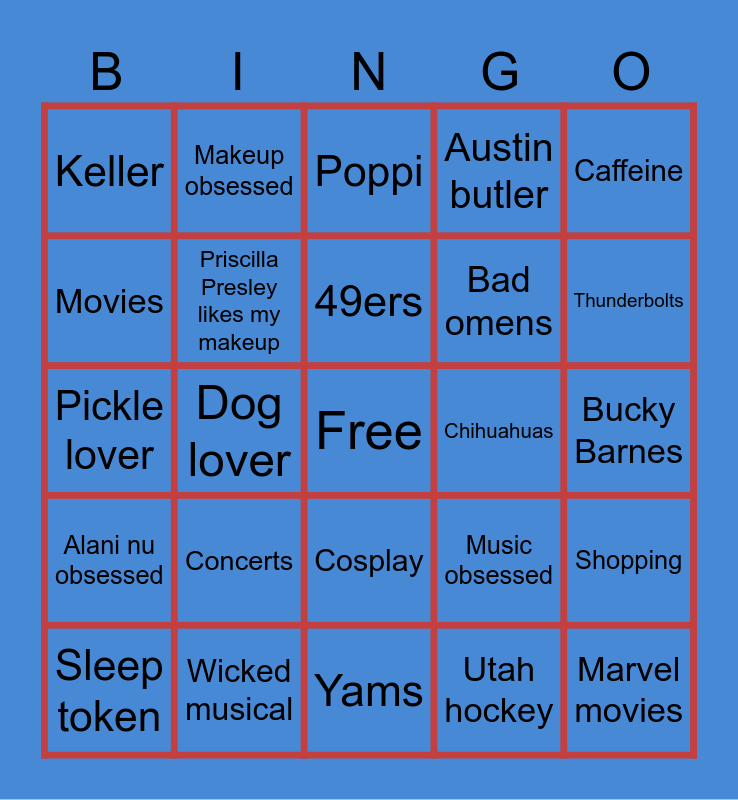 This bingo card has a free space and 24 words: Concerts, Wicked musical, 49ers, Sleep token, Caffeine, Keller, Movies, Makeup obsessed, Chihuahuas, Cosplay, Bad omens, Pickle lover, Music obsessed, Shopping, Priscilla Presley likes my makeup, Utah hockey, Bucky Barnes, Poppi, Thunderbolts, Dog lover, Marvel movies, Alani nu obsessed, Austin butler and Yams.