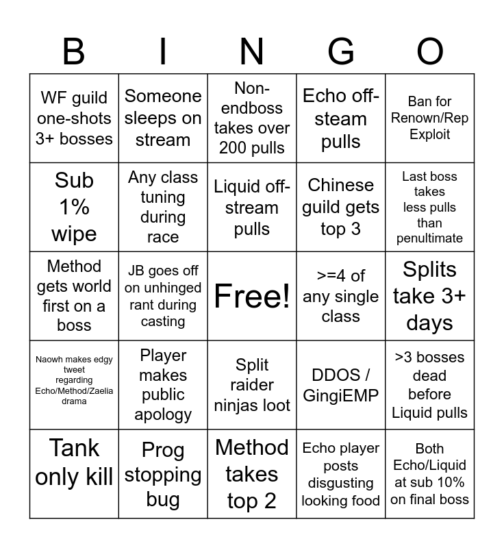 This bingo card has a free space and 24 words: Player makes public apology, Prog stopping bug, Liquid off-stream pulls, Tank only kill, Ban for Renown/Rep Exploit, WF guild one-shots 3+ bosses, Sub 1% wipe, Someone sleeps on stream, >=4 of any single class, Split raider ninjas loot, Chinese guild gets top 3, Method gets world first on a boss, DDOS / GingiEMP, >3 bosses dead before Liquid pulls, Any class tuning during race, Echo player posts disgusting looking food, Splits take 3+ days, Non-endboss takes over 200 pulls, Last boss takes less pulls than penultimate, JB goes off on unhinged rant during casting, Both Echo/Liquid at sub 10% on final boss, Naowh makes edgy tweet regarding Echo/Method/Zaelia drama, Echo off-steam pulls and Method takes top 2.