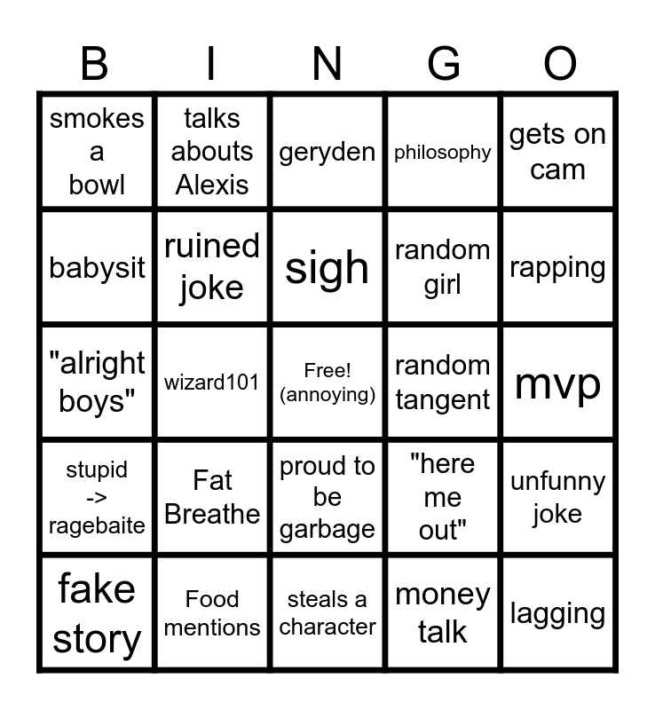 This bingo card has a free space and 24 words: Fat Breathe, Food mentions, sigh, fake story, gets on cam, smokes a bowl, babysit, talks abouts Alexis, random tangent, proud to be garbage, random girl, "alright boys", "here me out", unfunny joke, ruined joke, money talk, mvp, geryden, rapping, wizard101, lagging, stupid -> ragebaite, philosophy and steals a character.
