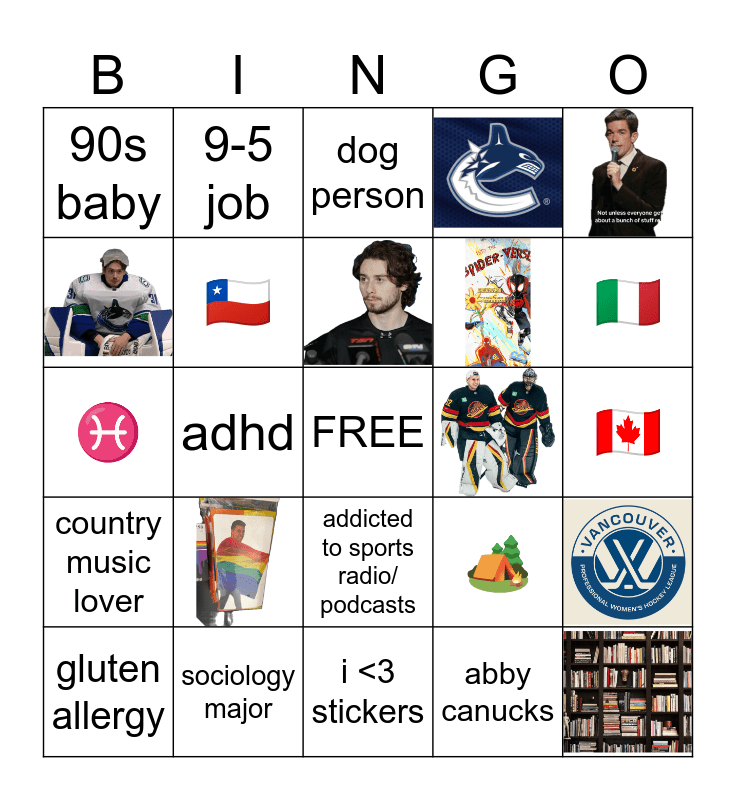 This bingo card has 9 images, a free space and 15 words: sociology major, gluten allergy, 90s baby, 9-5 job, addicted to sports radio/ podcasts, ♓️, 🏕️, 🇨🇱, abby canucks, 🇨🇦, dog person, 🇮🇹, adhd, country music lover and i <3 stickers.