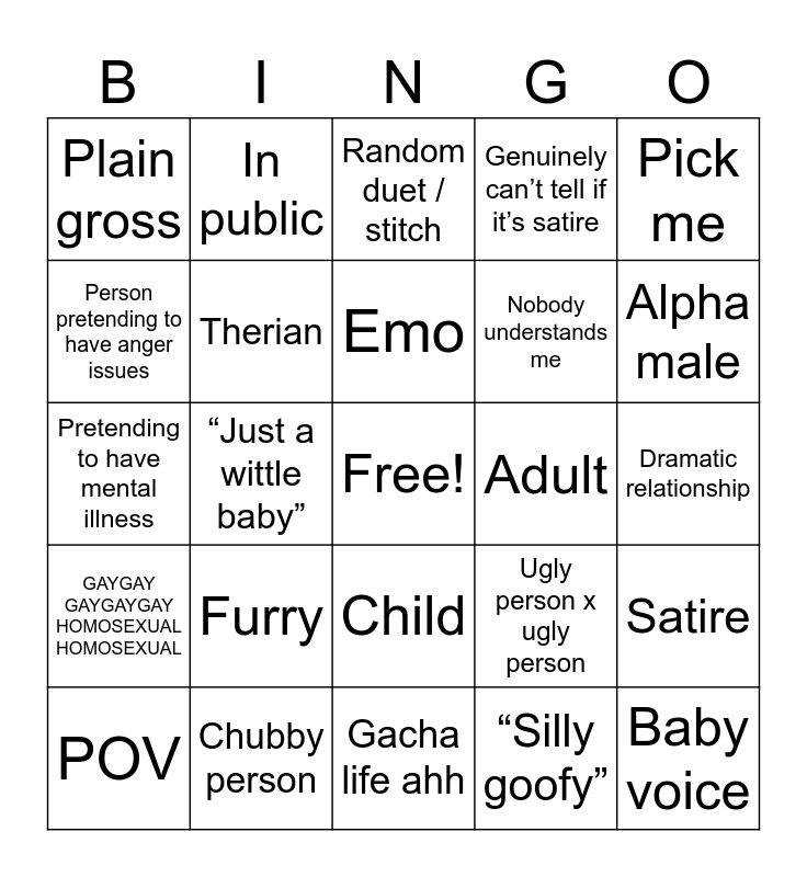 This bingo card has a free space and 24 words: Furry, Chubby person, Emo, POV, Pick me, Plain gross, Person pretending to have anger issues, In public, Adult, Child, Nobody understands me, Pretending to have mental illness, Ugly person x ugly person, Satire, Therian, “Silly goofy”, Dramatic relationship, Random duet / stitch, Alpha male, “Just a wittle baby”, Baby voice, GAYGAY GAYGAYGAY HOMOSEXUAL HOMOSEXUAL, Genuinely can’t tell if it’s satire and Gacha life ahh.