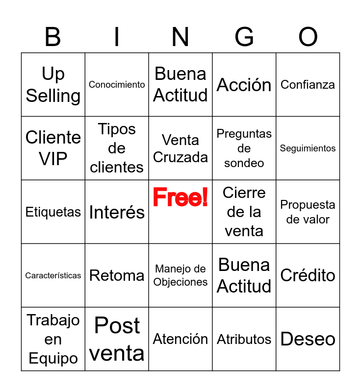 This bingo card has a free space and 24 words: Retoma, Post venta, Venta Cruzada, Trabajo en Equipo, Confianza, Up Selling, Cliente VIP, Conocimiento, Cierre de la venta, Manejo de Objeciones, Preguntas de sondeo, Etiquetas, Buena Actitud, Crédito, Tipos de clientes, Atributos, Propuesta de valor, Buena Actitud, Seguimientos, Interés, Deseo, Características, Acción and Atención.