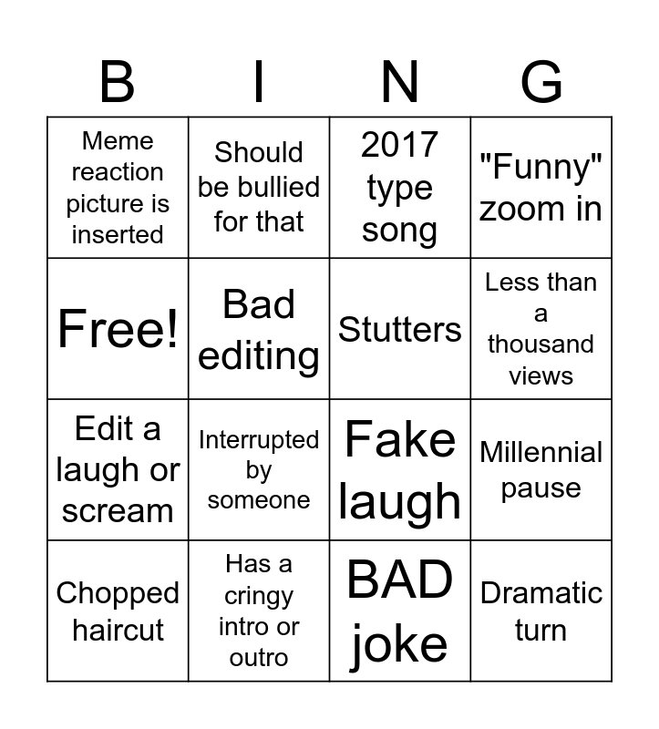 This bingo card has 16 words: Has a cringy intro or outro, Millennial pause, 2017 type song, Meme reaction picture is inserted, Edit a laugh or scream, Should be bullied for that, Fake laugh, BAD joke, Free!, Bad editing, Chopped haircut, "Funny" zoom in, Interrupted by someone, Less than a thousand views, Stutters and Dramatic turn.