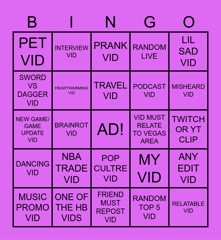 This bingo card has a free space and 24 words: NBA TRADE VID, ONE OF THE HB VIDS, TRAVEL VID, MUSIC PROMO VID, LIL SAD VID, PET VID, SWORD VS DAGGER VID, INTERVIEW VID, VID MUST RELATE TO VEGAS AREA, POP CULTRE VID, PODCAST VID, NEW GAME/ GAME UPDATE VID, MY VID, ANY EDIT VID, HEARTWARMING VID, RANDOM TOP 5 VID, TWITCH OR YT CLIP, PRANK VID, MISHEARD VID, BRAINROT VID, RELATABLE VID, DANCING VID, RANDOM LIVE and FRIEND MUST REPOST VID.