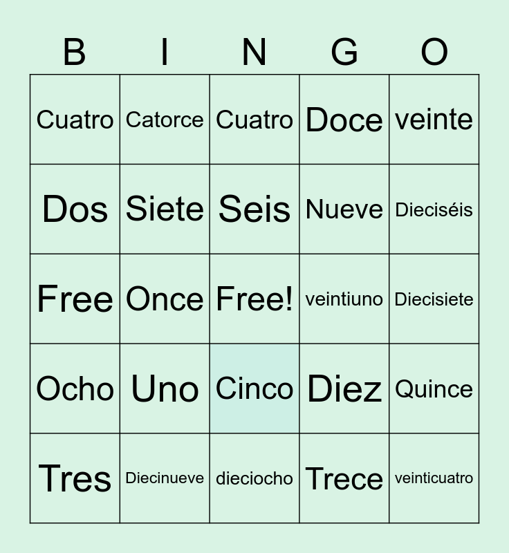 This bingo card has a free space and 24 words: Uno, Diecinueve, Seis, Tres, veinte, Cuatro, Dos, Catorce, veintiuno, Cinco, Nueve, Free, Diez, Quince, Siete, Trece, Diecisiete, Cuatro, Dieciséis, Once, veinticuatro, Ocho, Doce and dieciocho.