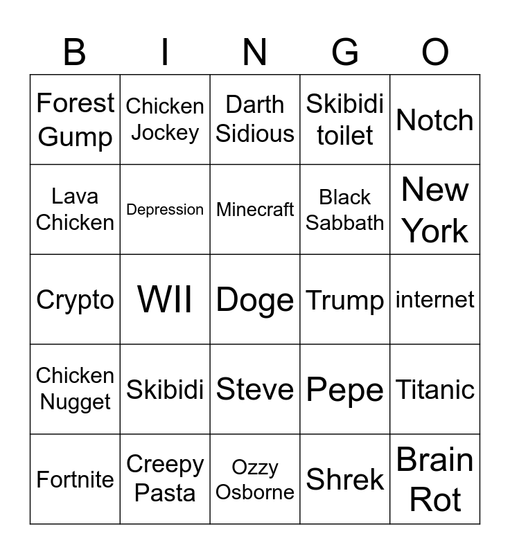 This bingo card has a free space and 24 words: Skibidi, Creepy Pasta, Minecraft, Fortnite, Notch, Forest Gump, Lava Chicken, Chicken Jockey, Trump, Steve, Black Sabbath, Crypto, Pepe, Titanic, Depression, Shrek, internet, Darth Sidious, New York, WII, Brain Rot, Chicken Nugget, Skibidi toilet and Ozzy Osborne.