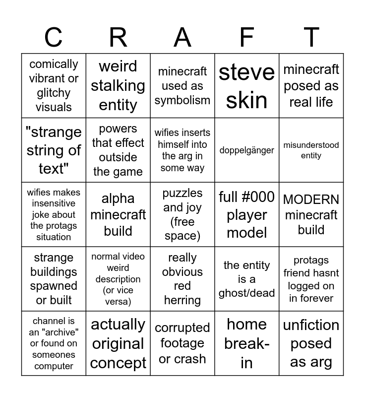 This bingo card has a free space and 25 words: normal video weird description (or vice versa), corrupted footage or crash, wifies inserts himself into the arg in some way, channel is an "archive" or found on someones computer, minecraft posed as real life, comically vibrant or glitchy visuals, "strange string of text", weird stalking entity, full #000 player model, really obvious red herring, doppelgänger, wifies makes insensitive joke about the protags situation, the entity is a ghost/dead, protags friend hasnt logged on in forever, powers that effect outside the game, government project, MODERN minecraft build, minecraft used as symbolism, misunderstood entity, alpha minecraft build, unfiction posed as arg, actually original concept, strange buildings spawned or built, steve skin and home break-in.