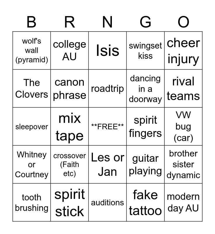 This bingo card has a free space and 24 words: crossover (Faith etc), spirit stick, roadtrip, tooth brushing, cheer injury, wolf's wall (pyramid), The Clovers, college AU, spirit fingers, Les or Jan, dancing in a doorway, sleepover, guitar playing, brother sister dynamic, canon phrase, fake tattoo, VW bug (car), Isis, rival teams, mix tape, modern day AU, Whitney or Courtney, swingset kiss and auditions.