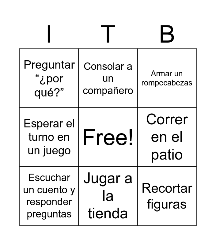This bingo card has a free space and 11 words: Construir una torre con bloques, Jugar a la tienda, Recortar figuras, Escuchar un cuento y responder preguntas, Consolar a un compañero, Armar un rompecabezas, Correr en el patio, Pintar con acuarelas, Esperar el turno en un juego, Preguntar “¿por qué?” and Ordenar imágenes para contar una historia.