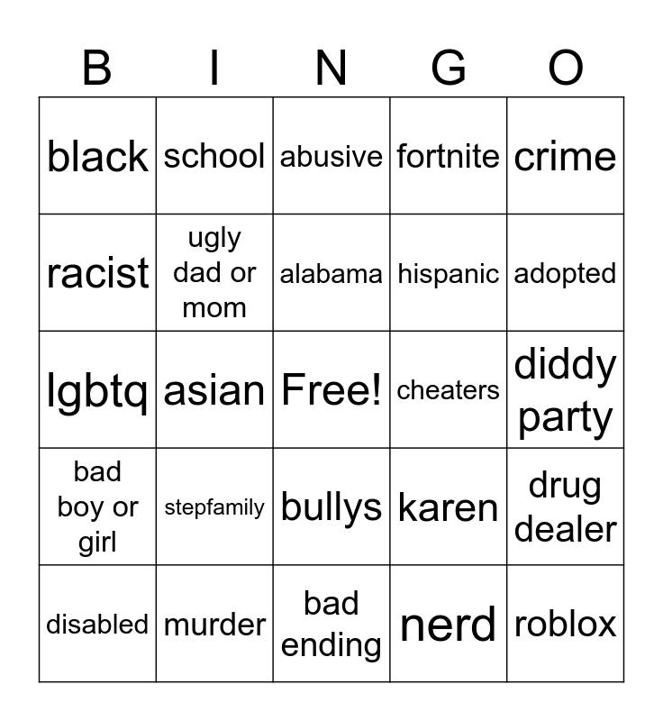 This bingo card has a free space and 24 words: stepfamily, murder, alabama, disabled, crime, black, racist, school, cheaters, bullys, hispanic, lgbtq, karen, drug dealer, ugly dad or mom, nerd, diddy party, abusive, adopted, asian, roblox, bad boy or girl, fortnite and bad ending.