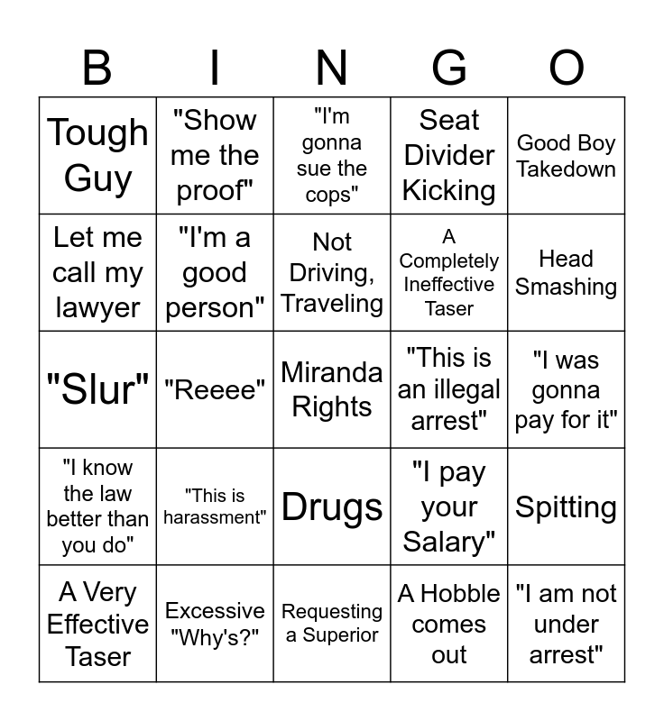 This bingo card has a free space and 24 words: "This is harassment", Excessive "Why's?", Not Driving, Traveling, A Very Effective Taser, Good Boy Takedown, Tough Guy, Let me call my lawyer, "Show me the proof", "This is an illegal arrest", Drugs, A Completely Ineffective Taser, "Slur", "I pay your Salary", Spitting, "I'm a good person", A Hobble comes out, "I was gonna pay for it", "I'm gonna sue the cops", Head Smashing, "Reeee", "I am not under arrest", "I know the law better than you do", Seat Divider Kicking and Requesting a Superior.