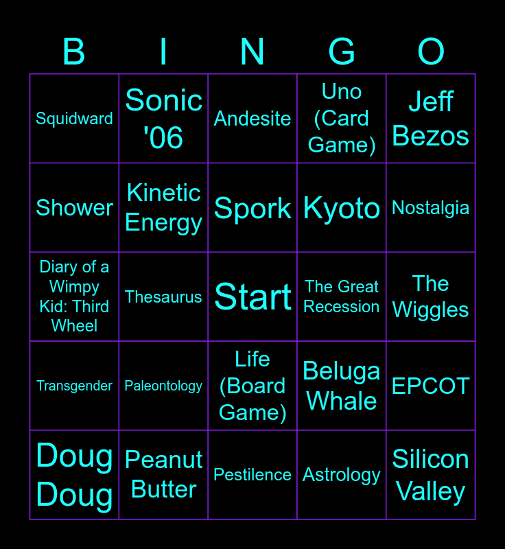 This bingo card has a free space and 24 words: Paleontology, Peanut Butter, Spork, Doug Doug, Jeff Bezos, Squidward, Shower, Sonic '06, The Great Recession, Life (Board Game), Kyoto, Diary of a Wimpy Kid: Third Wheel, Beluga Whale, EPCOT, Kinetic Energy, Astrology, The Wiggles, Andesite, Nostalgia, Thesaurus, Silicon Valley, Transgender, Uno (Card Game) and Pestilence.