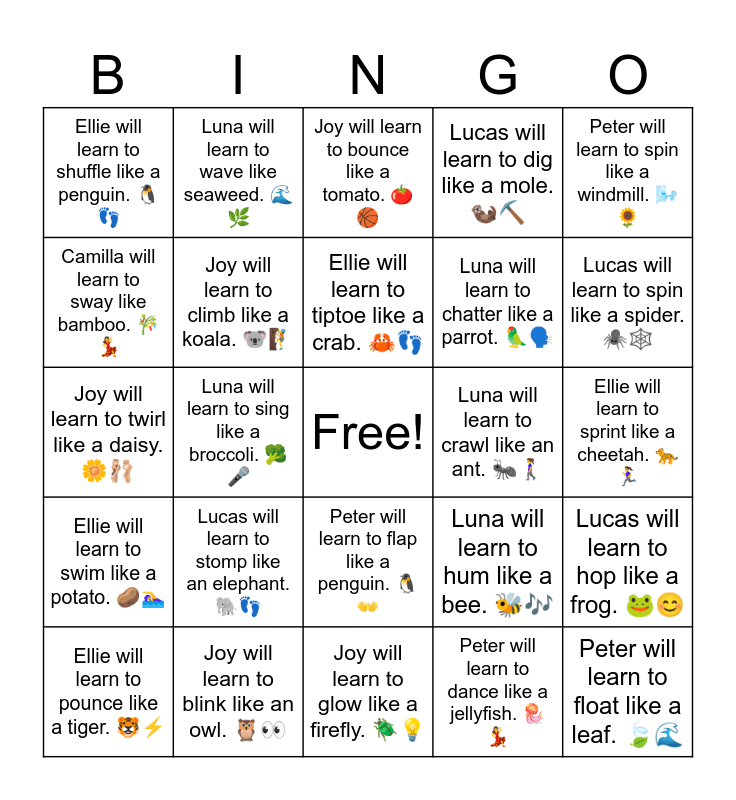 This bingo card has a free space and 32 words: Peter will learn to dance like a jellyfish. πͺΌπ, Lucas will learn to jump like a grasshopper. π¦π¦, Luna will learn to sing like a broccoli. π₯¦π€, Camilla will learn to run like a squirrel. πΏοΈπββοΈ, Ellie will learn to swim like a potato. π₯πββοΈ, Joy will learn to climb like a koala. π¨π§, Peter will learn to spin like a windmill. π¬οΈπ», Lucas will learn to hop like a frog. πΈπ, Luna will learn to wave like seaweed. ππΏ, Camilla will learn to roar like a kitten. π±π¦, Ellie will learn to tiptoe like a crab. π¦π£, Joy will learn to bounce like a tomato. π π, Peter will learn to stretch like a sunflower. π»π§, Lucas will learn to roll like a watermelon. ππ€ΈββοΈ, Luna will learn to crawl like an ant. ππΆββοΈ, Camilla will learn to wiggle like a worm. πͺ±π, Ellie will learn to pounce like a tiger. π―β‘, Joy will learn to twirl like a daisy. πΌπ©°, Peter will learn to flap like a penguin. π§π, Lucas will learn to stomp like an elephant. ππ£, Luna will learn to hum like a bee. ππΆ, Camilla will learn to slide like a banana peel. ππ, Ellie will learn to sprint like a cheetah. ππββοΈ, Joy will learn to blink like an owl. π¦π, Peter will learn to float like a leaf. ππ, Lucas will learn to dig like a mole. π¦¦βοΈ, Luna will learn to chatter like a parrot. π¦π£οΈ, Camilla will learn to sway like bamboo. ππ, Ellie will learn to shuffle like a penguin. π§π£, Joy will learn to glow like a firefly. πͺ²π‘, Peter will learn to sneak like a cat. πββ¬π€« and Lucas will learn to spin like a spider. π·οΈπΈοΈ.