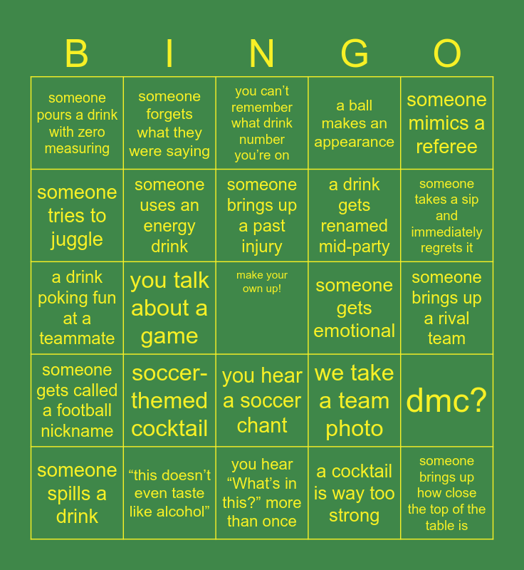 This bingo card has a free space and 39 words: you forget what’s in your own cocktail, someones drink sounds gross but slaps, you lose count of how many you’ve had, someone uses an energy drink, someone spills a drink, you hear a soccer chant, someone brings up a past injury, someone shows a football photo, someone mimics a referee, someone gets called a football nickname, you talk about a game, a ball makes an appearance, someone brings up how close the top of the table is, someone brings up a rival team, someone gets emotional, soccer-themed cocktail, someone talks about a goal they scored, someone pours a drink with zero measuring, someone adds electrolytes to their cocktail, we take a team photo, someone tries to juggle, you hear “What’s in this?” more than once, a drink gets renamed mid-party, someone takes a sip and immediately regrets it, a team takes ages to make their cocktail, someone drinks someone else's drink, a cocktail is so strong it clears your sinuses, someone takes a shot directly from the bottle, you finish a drink too quickly, someone forgets what they were saying, someone says "this is my last" and keeps drinking, someone takes a drink into the bathroom with them, you can’t remember what drink number you’re on, “this doesn’t even taste like alcohol”, a cocktail is way too strong, someone mixes liquors that should never meet, dmc?, a drink poking fun at a teammate and someone stains something.