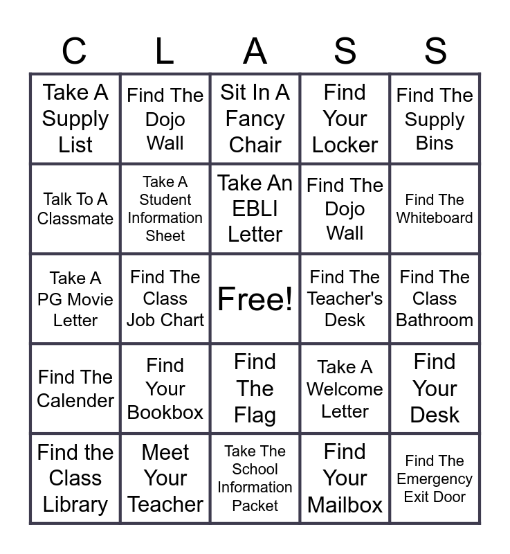This bingo card has a free space and 24 words: Find Your Bookbox, Meet Your Teacher, Take An EBLI Letter, Find the Class Library, Find The Supply Bins, Take A Supply List, Talk To A Classmate, Find The Dojo Wall, Find The Teacher's Desk, Find The Flag, Find The Dojo Wall, Take A PG Movie Letter, Take A Welcome Letter, Find Your Desk, Take A Student Information Sheet, Find Your Mailbox, Find The Class Bathroom, Sit In A Fancy Chair, Find The Whiteboard, Find The Class Job Chart, Find The Emergency Exit Door, Find The Calender, Find Your Locker and Take The School Information Packet.