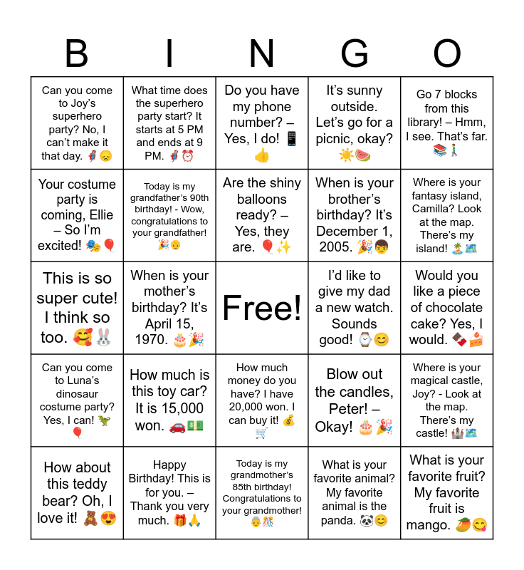 This bingo card has a free space and 32 words: What is your favorite animal? My favorite animal is the panda. ๐ผ๐, Itโs raining outside. Letโs stay inside and watch movies, okay? โ๐ฌ, When is your motherโs birthday? Itโs April 15, 1970. ๐๐, Your graduation party is coming, Mina โ So Iโm happy about that! ๐๐ฅณ, Can you come to Lunaโs dinosaur costume party? Yes, I can! ๐ฆ๐, Today is my grandfatherโs 90th birthday! - Wow, congratulations to your grandfather! ๐๐ด, Go 7 blocks from this library! โ Hmm, I see. Thatโs far. ๐๐ถโโ๏ธ, Where is your magical castle, Joy? - Look at the map. Thereโs my castle! ๐ฐ๐บ๏ธ, What time does the superhero party start? It starts at 5 PM and ends at 9 PM. ๐ฆธโโ๏ธโฐ, The fairy tale party will be so much fun! โ Yes, you are right! ๐งโโ๏ธ๐, Are the shiny balloons ready? โ Yes, they are. ๐โจ, Do you have my phone number? โ Yes, I do! ๐ฑ๐, Where shall we go to buy a present? Letโs go to the mall. ๐๏ธ๐ฌ, I have to buy a present for my sister. Okay letโs go shopping! ๐๐ญ, Iโd like to give my dad a new watch. Sounds good! โ๐, What do you want to buy your best friend? Well, Iโm thinking about it. ๐ค๐, How about this teddy bear? Oh, I love it! ๐งธ๐, This is so super cute! I think so too. ๐ฅฐ๐ฐ, How much money do you have? I have 20,000 won. I can buy it! ๐ฐ๐, How much is this toy car? It is 15,000 won. ๐๐ต, Blow out the candles, Peter! โ Okay! ๐๐, Hello, Luna! Weโre here! ๐๐, Would you like a piece of chocolate cake? Yes, I would. ๐ซ๐ฐ, Happy Birthday! This is for you. โ Thank you very much. ๐๐, What is your favorite fruit? My favorite fruit is mango. ๐ฅญ๐, Itโs sunny outside. Letโs go for a picnic, okay? โ๏ธ๐, When is your brotherโs birthday? Itโs December 1, 2005. ๐๐ฆ, Your costume party is coming, Ellie โ So Iโm excited! ๐ญ๐, Can you come to Joyโs superhero party? No, I canโt make it that day. ๐ฆธโโ๏ธ๐, Today is my grandmotherโs 85th birthday! Congratulations to your grandmother! ๐ต๐, Go 10 blocks from this park! โ Wow, thatโs a long walk! ๐ณ๐ถโโ๏ธ and Where is your fantasy island, Camilla? Look at the map. Thereโs my island! ๐๏ธ๐บ๏ธ.